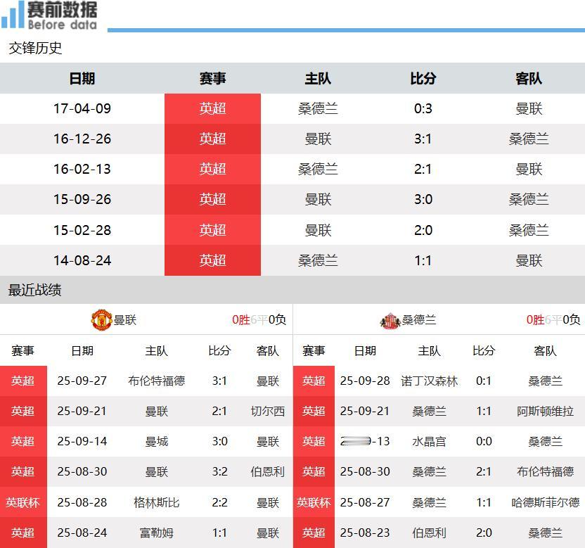 Đầu tiên: Tình huống của hai đội! Sau sáu vòng đầu tiên của Premier League, Manchester United xếp thứ 14 với 2 chiến thắng, 1 trận hòa, 3 trận thua, 7 điểm; Sunderland xếp thứ 6 với 3 chiến thắng, 2 trận hòa, 1 trận thua, 11 điểm. Trong vòng cuối cùng của Premier League, Manchester United đã thua 1-3 trước Brentford; Sunderland đánh bại Nottingham Forest 1-0.