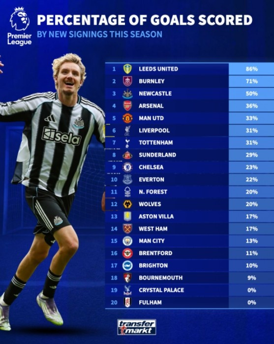Tin tức ngày 9 tháng 10 Premier League đã thi đấu được 7 vòng trong mùa giải mới. Bản hợp đồng mới của 20 đội có vai trò gì trong mùa hè này? Thị trường chuyển nhượng Đức tính đến tỷ lệ bàn thắng do cầu thủ mới ghi trong tổng số bàn thắng của mỗi đội, trong đó Leeds United có tỷ lệ cao nhất là 86%, Arsenal, Manchester United và Liverpool lần lượt xếp thứ 4, 5 và 6.