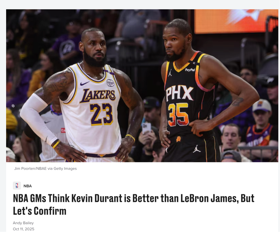 Vào ngày 13 tháng 10, vẫn còn 9 ngày nữa là mùa giải NBA mới bắt đầu. Đầu ngày hôm nay, phóng viên Andy Bailey của BR đã so sánh Durant và James từ năm khía cạnh: sút, tổ chức, phòng thủ, sức bền và quả bóng chủ chốt. Chung cuộc, Durant đánh bại James với tỷ số 3-2.
